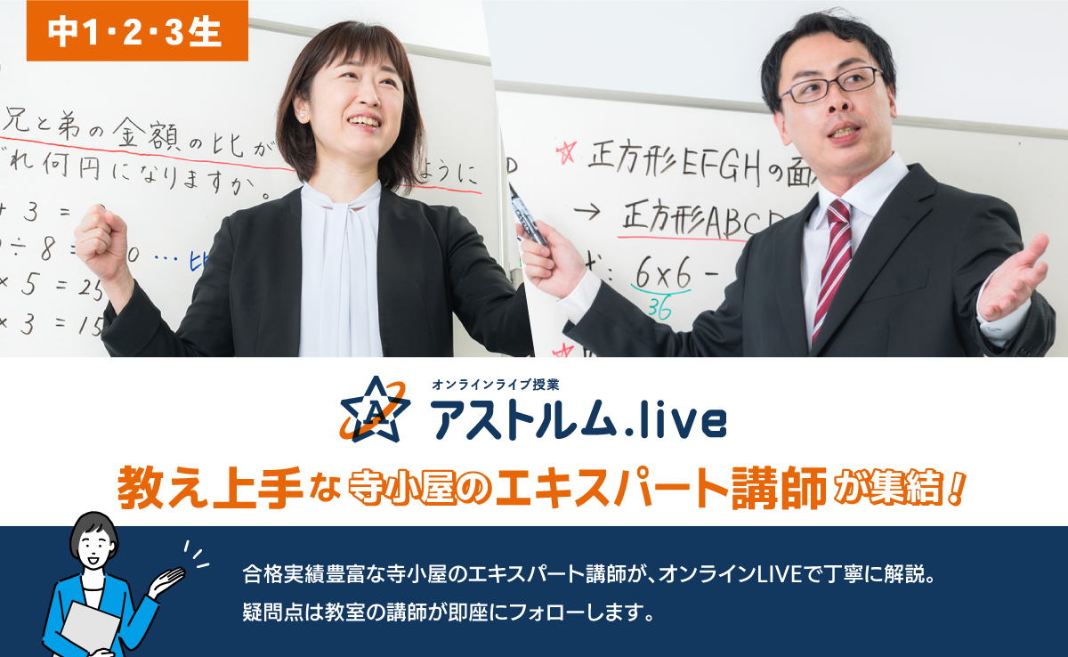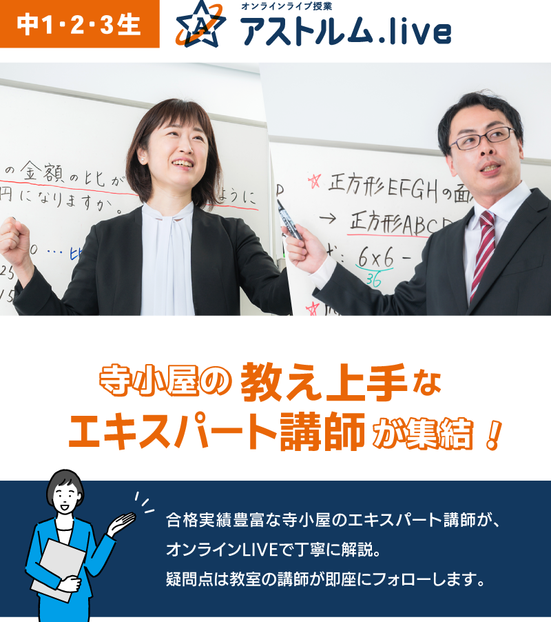 寺小屋グループでは、各教室をオンラインでつなぎ、リアルタイムで受講できる一斉ライブ授業「アストルム.live」を開講しています。授業を担当するのは高い合格実績を出している寺小屋のエキスパート講師。学校内容に合わせた標準的なレベルで授業を行い、成績アップ・志望校合格へと導きます。自宅で受けるオンライン授業とは違い、他の教室の生徒と授業を一緒に受け、双方向にやり取りできるライブ感のある授業です。学習フォローや質問対応、進路指導などは、各教室の講師が丁寧に対応します。