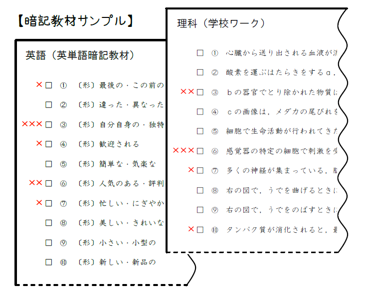 いいえ。もちろん、テスト範囲の問題は一通り確認しなければいけませんが、暗記の最大のポイントは、「覚えている問題」と「覚えていない問題」を分別して「覚えていない問題を集中して覚えること」です!こちらの画像を見てください。
