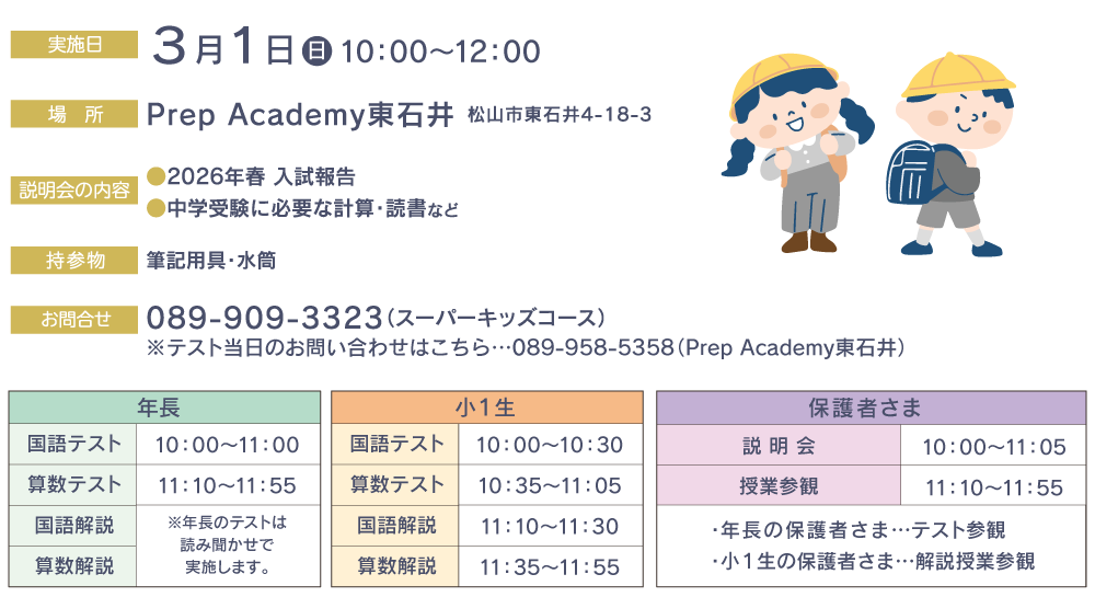 寺小屋グループでは、中学受験をお考えの小1・2生を対象に『スーパーキッズコース』を開講しており、中学受験合格を目標とした指導をおこなっています。次年度開講にあたり、年長・小1生のお子さまを対象とした『ワセアカチャレンジテスト』を実施いたします。チャレンジテストでは、中学受験を念頭に、現段階での学習習得状況を測ることができ、発想力や思考力などの発達状況もご確認いただけます。ぜひお気軽にご参加ください。