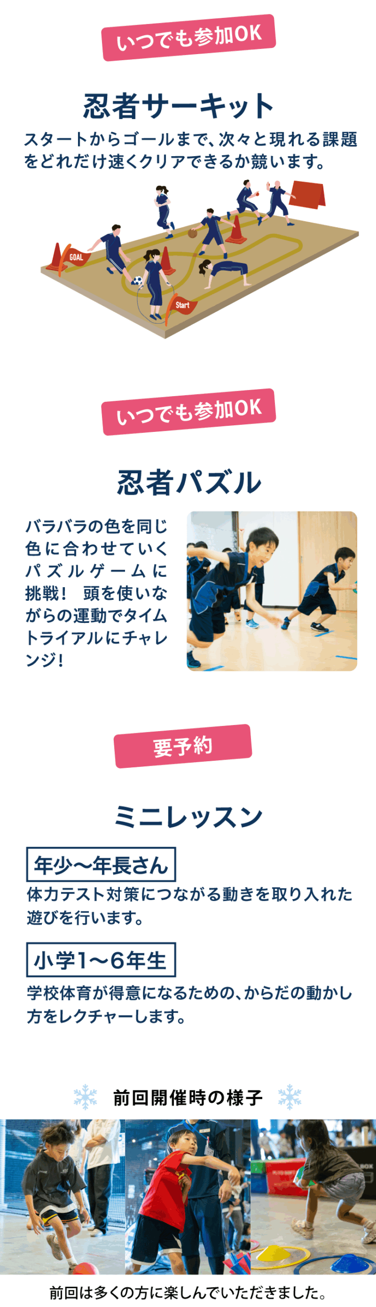 年少~小学生対象 | 忍者パズル、忍者サーキット13:00~16:00 ※上記プログラムはいつお越しいただいてもご参加いただけます。 |
