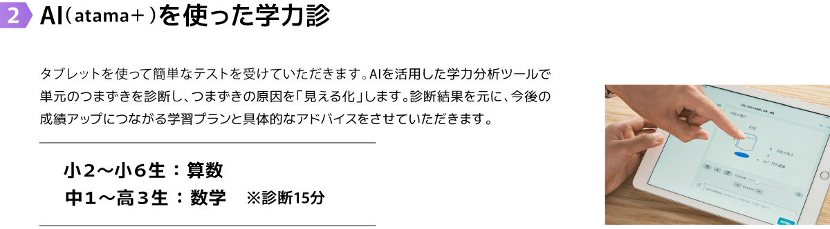 タブレットを使って簡単なテストを受けていただきます。AIを活用した学力分析ツールで単元のつまずきを診断し、つまずきの原因を「見える化」します。診断結果を元に、今後の成績アップにつながる学習プランと具体的なアドバイスをさせていただきます。