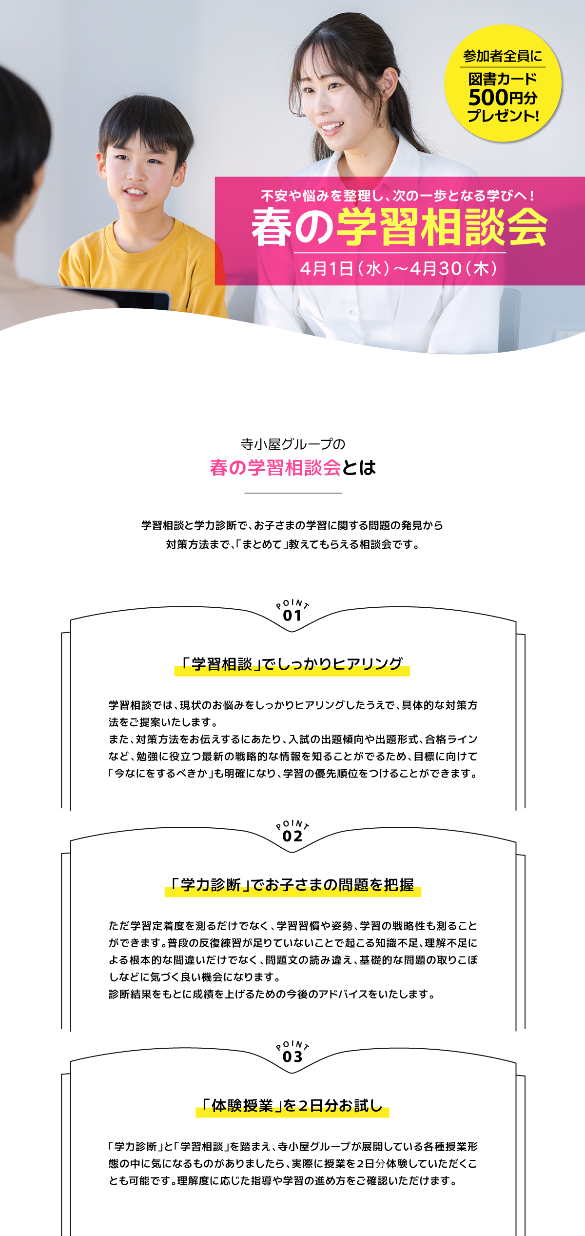 学習状況や成績の推移、得意・不得意科目、日々の勉強時間や学習方法、さらには進路に関するご希望など、丁寧にヒアリングをさせていただきます。そのうえで、お子さまの目標や状況に最適な教材・学習計画・進路情報などを踏まえた具体的なアドバイスをさせていただきます。