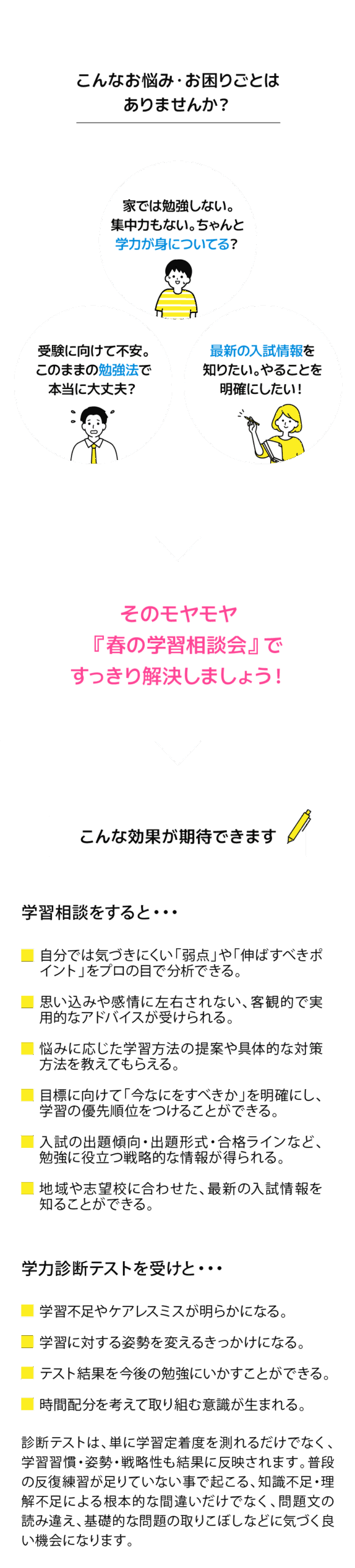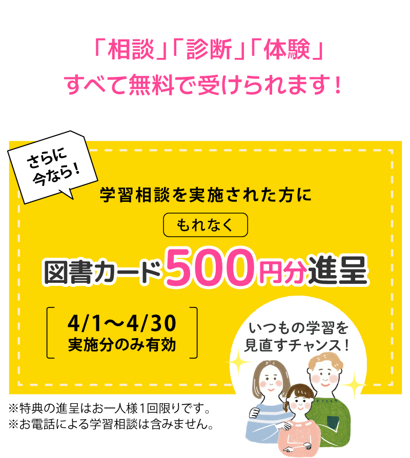 ※相談内容にもよりますが、相談時に成績表や採点済みのテストなどがあればスムーズです。