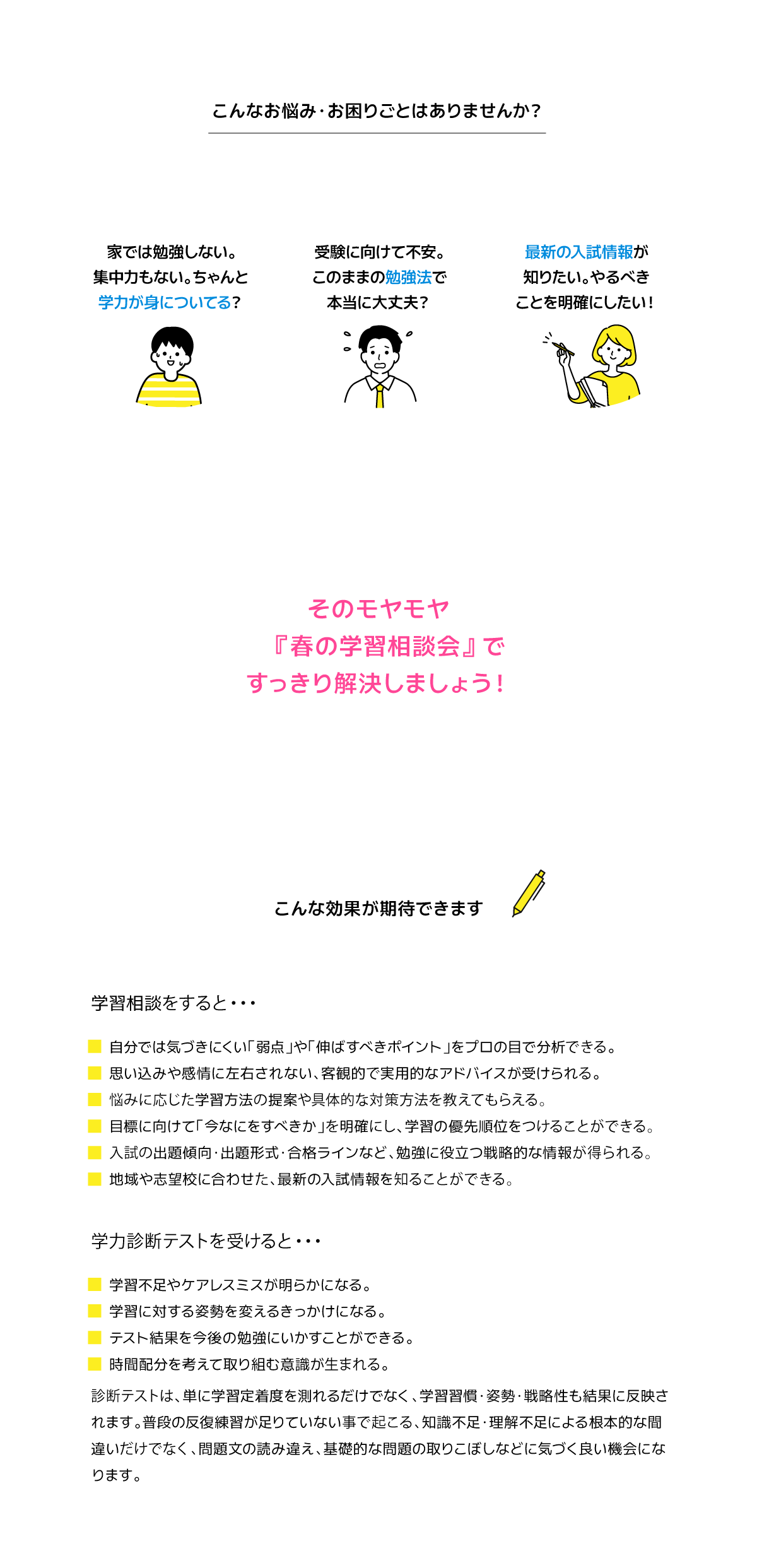 | ・入試に向けてスケジュールを立てたい ・入試の最新情報を知りたい ・今の成績、勉強法で本当に大丈夫? など |